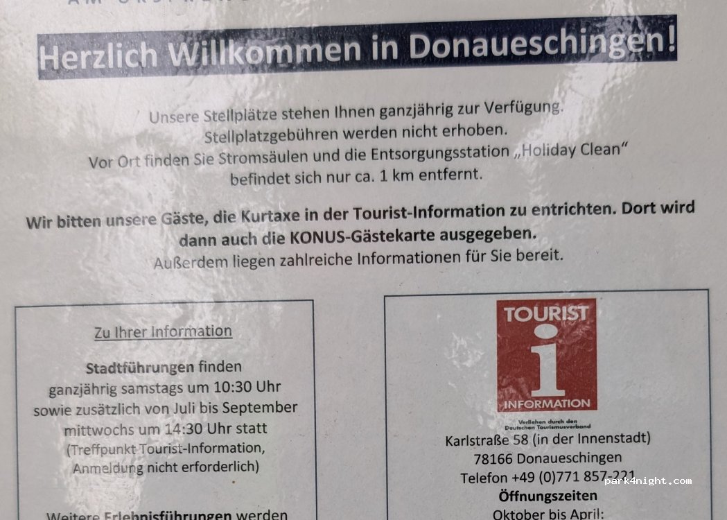 toller stellplatz mitten in der Stadt. kurze Fußwege zum stadtzentrum, zum Museum und auch zum donauursprung. bitte daran denken die Kurtaxe zu bezahlen, damit es auch in Zukunft weiterhin solche tollen Stellplätze entstehen können.