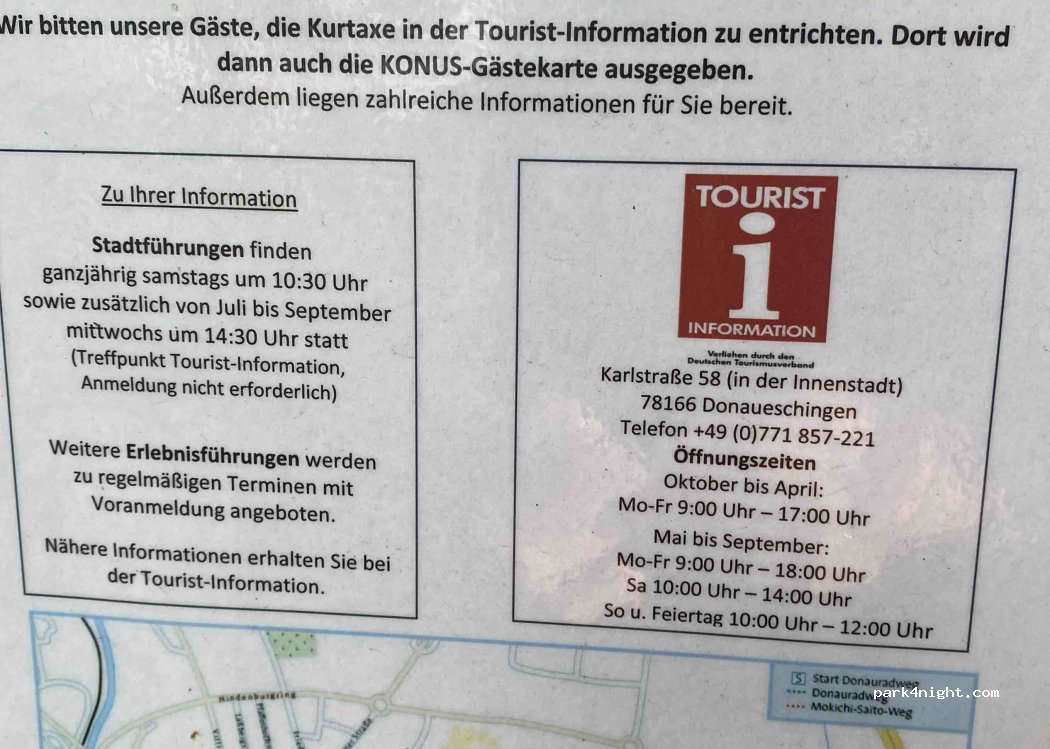 Ruhiger ebener Platz unweit der Donauquelle - teils schattig. Bei Bedarf Strom verfügbar. Auf den Schildern ist keine Informationen bzgl. Kurtaxe ersichtlich ...