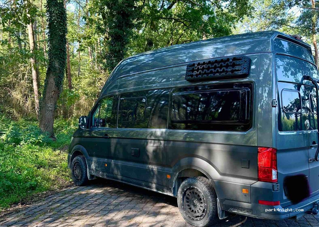 Einfacher Wandererparkplatz am Waldrand unter Bäumen. Sehr gut für eine Nacht