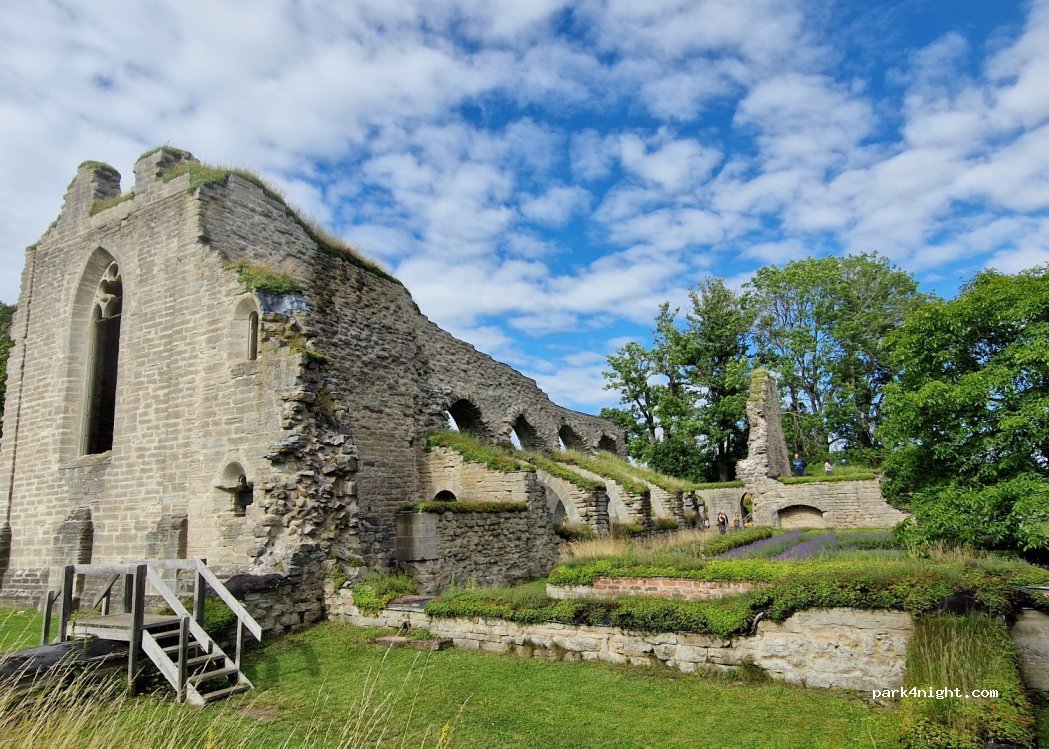 Sonniger Gratis-Parkplatz direkt neben den sehenswerten Kloster-Ruinen. Tagsüber viele Besucher, in der Nacht ruhig - nur in der Ferne die Straße zu hören. Mehrere Holzsitzgruppen. Die Toilette war im April geschlossen. Keine Abfallentsorgung möglich. Allerdings ist in wenigen Minuten mit dem Rad ein anderer Rastplatz erreichbar mit Mülltonnen und Trockenklos ( dort kostet ein Womo150 SEK).