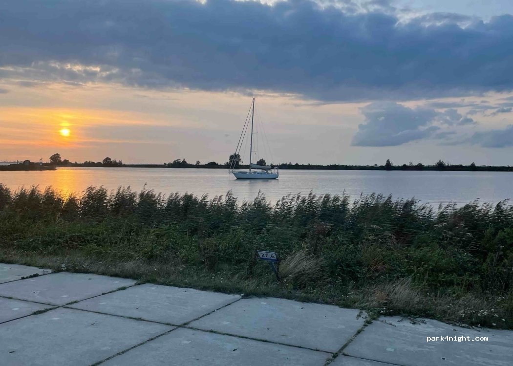 Parking overlooking a large body of water, the road is a little busy behind but the view with the sunset and Amsterdam at night in the west are a great consolation ...
