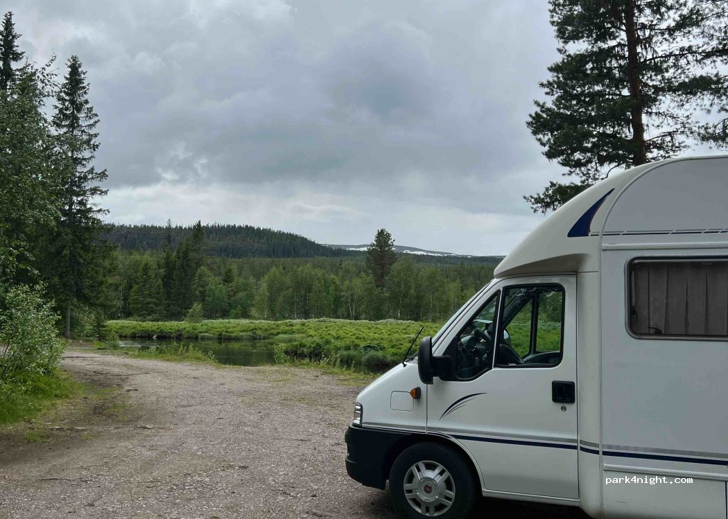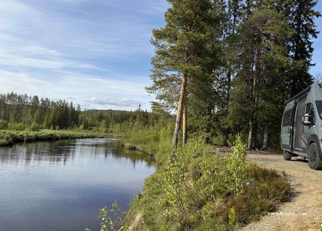 Lieu parfait et magnifique avant une visite matinale aux chutes Njupeskår. 2 vraies places près de la rivière: l'une parfaite pour un camping-car, l'autre plus adaptée à un van. Venir tôt - 17h30: plus de place. 4 véhicules ont dû faire demi-tour. La nuit où on y était un troisième véhicule s'est mis dans le demi-tour. Cela nous a pas dérangé mais peut bloquer le passage aux suivants.