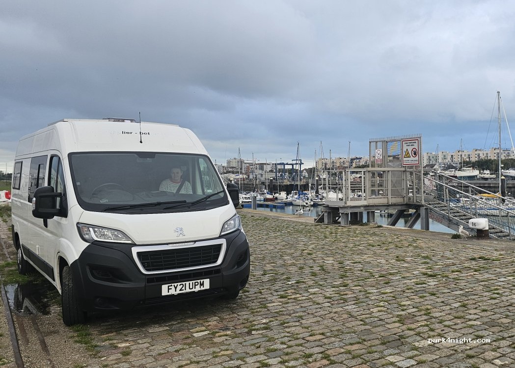Effectivement l'aire du front de mer n'existe plus, nouvelle aire payante à l'entrée de Blériot plage, toutefois sur le bassin ouest malgré un panneau stipulant"aire fermé" le stationnement reste possible comme tout autre véhicule, proche commerces, bars, restaurants etc... Promenade le long des quais...
