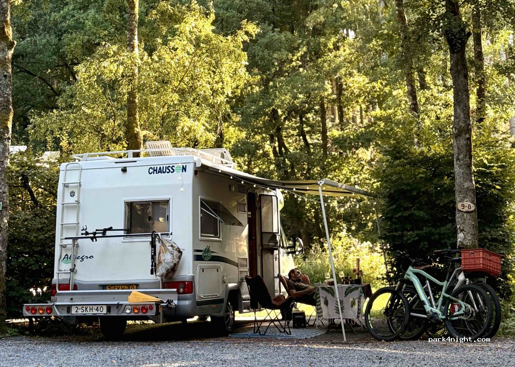 Les - emplacement pas large mais plutôt long, le prix 25€ (pour 1 nuit avec 2 pers avec elec et 1 van) attention uniquement en liquide les accueil très sympa en français, vue directe sur l'eau, camping ombragé et très vert, les sanitaires sont très propres, pas de jetons pour la douche (compris dans le prix), arrivée à partir de 14h départ 12h le on entend l'eau qui coule c'est cool