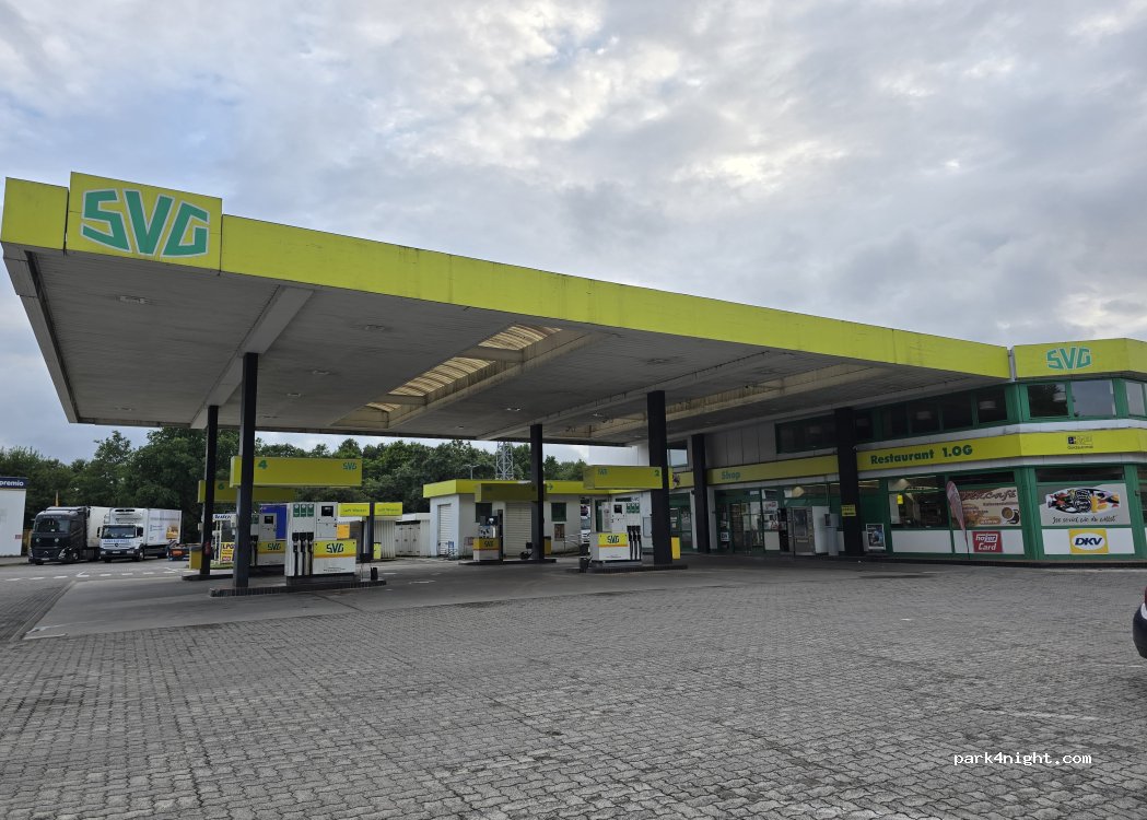 Klassischer Autohof, man hört die Bundesstrasse, aber nicht zu laut. Duschen/WC nur bei geöffnetem Tankstellenshop möglich. Duschen für 2.50 €, soweit sauber.