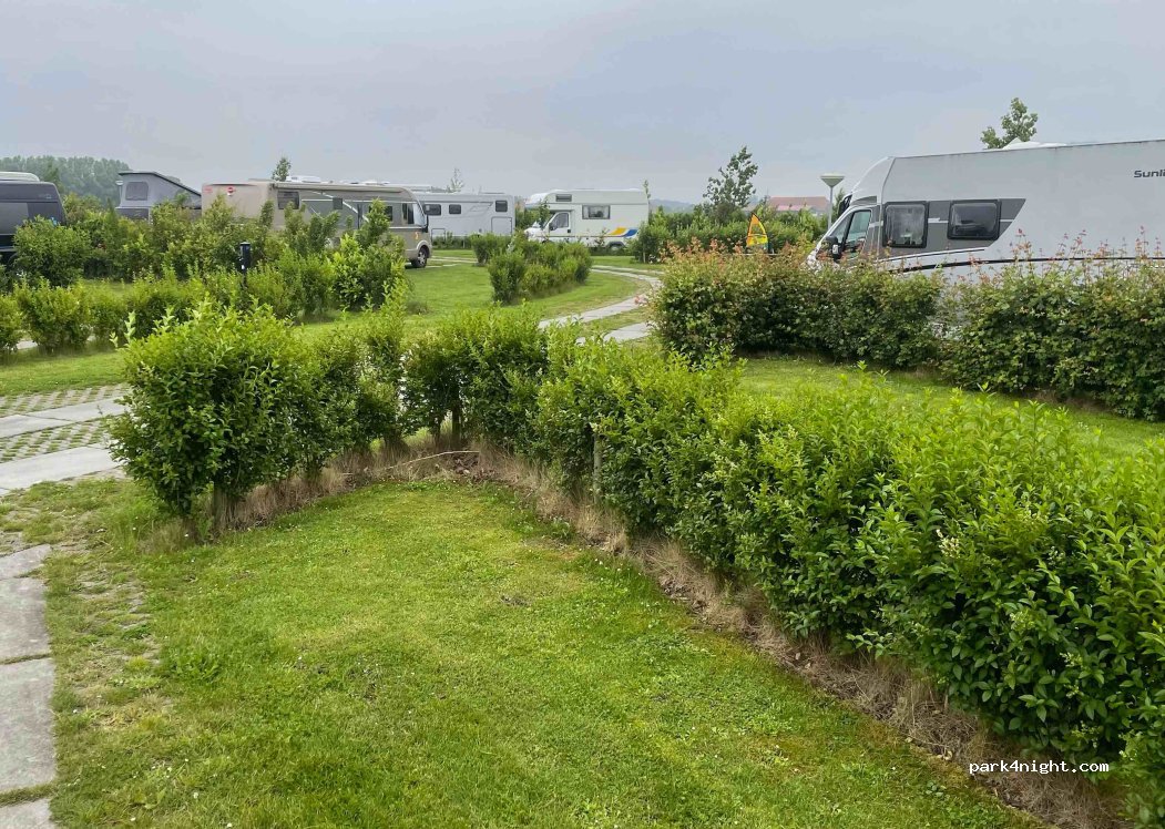 Mooi camperpark: reserveren of ter plekje met bankkaart. Er zijn 36 plaatsen met 2 verharde stroken en mooi stuk gras. Water, afvoer, elekt op de standplaats, super! afvalcontainers, type kleine kliko 240l, zaten vol, met slechts een 15-tal campers! Het vertrekuur om 11h is campingmentaliteit en heeft niks met een camperplek vandoen. 24h moet gewoon 24h zijn, om het even wanneer je aankomt!