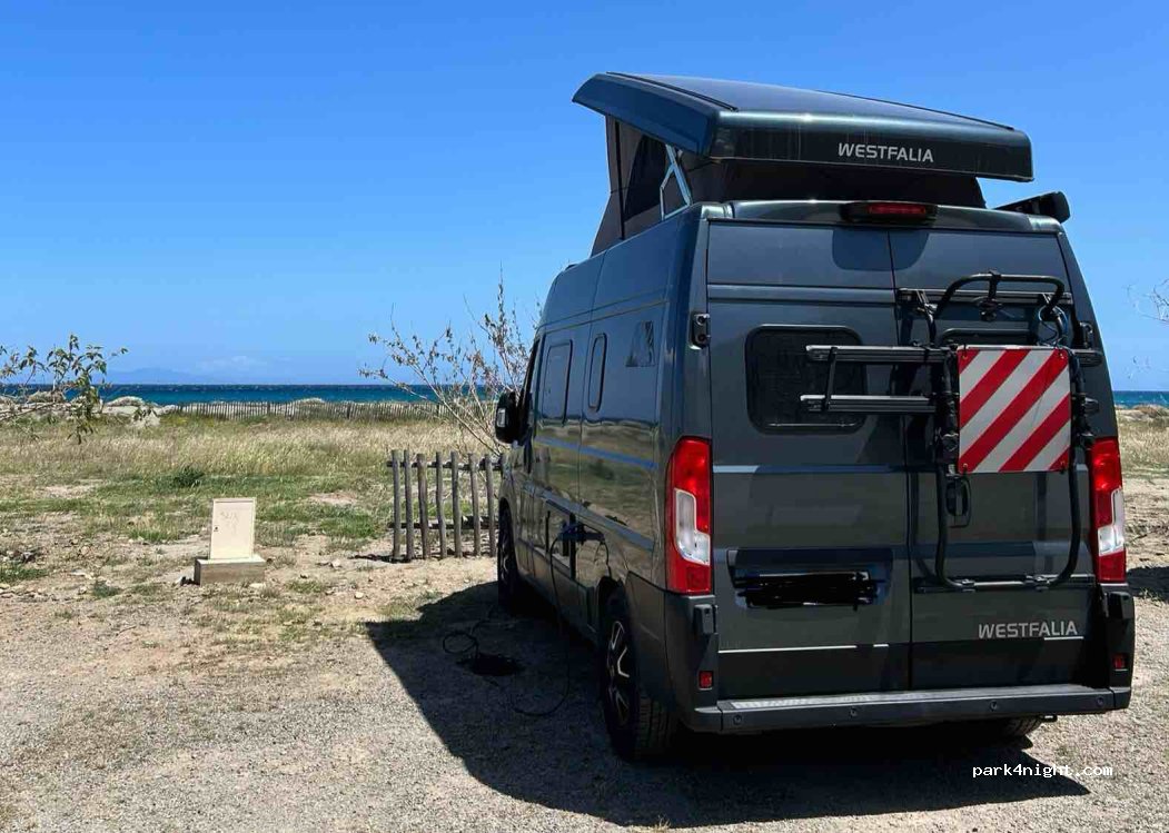 Le point positif : la vue mer et accès plage immédiat, pratique pour débarquement tardif ou embarquement matinal. Le négatif : paillote boîte de nuit à côté avec musique très forte jusqu’à 2h , le train, la circulation, peu (ou pas) d’ombre pour les vans et cc). Ressemble plus à un parking qu’à un camping.