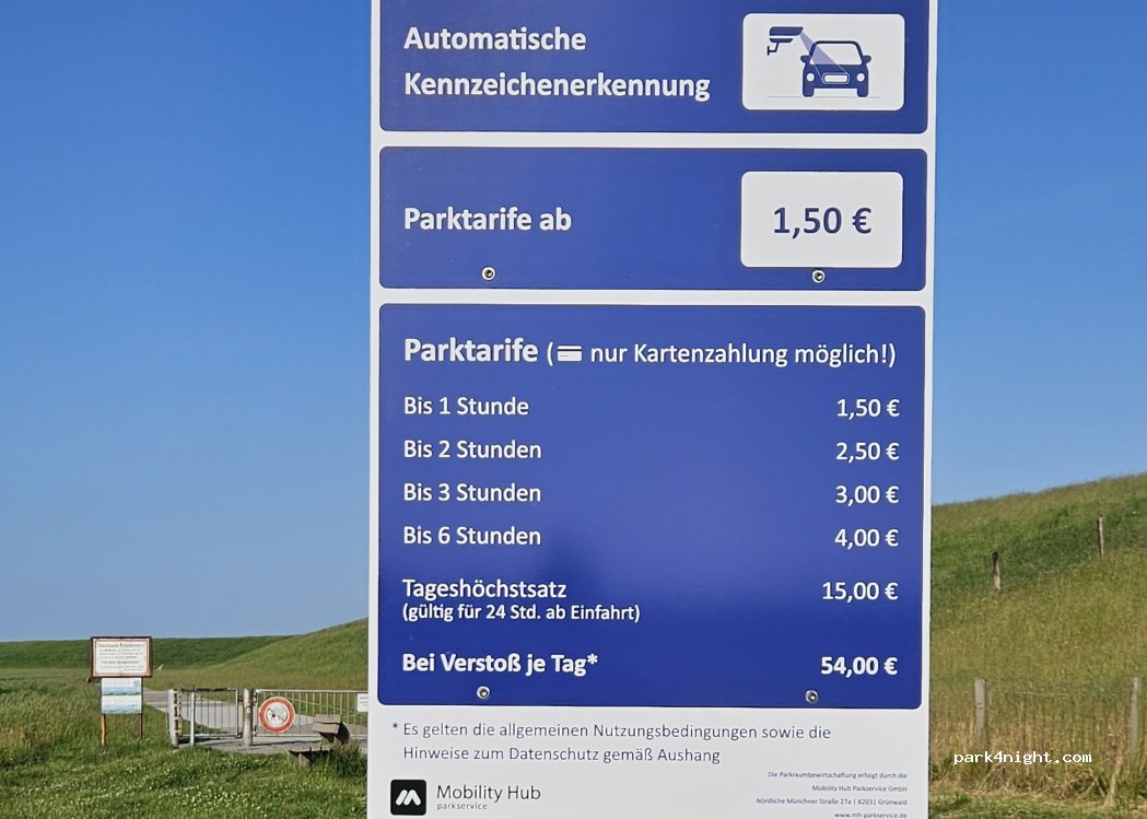 Wohnmobile dürfen von 10-18 Uhr parken. Kosten 1€ eine Stunde. Parkplatz befindet sich direkt am Leuchtturm aus den Otto Filmen.