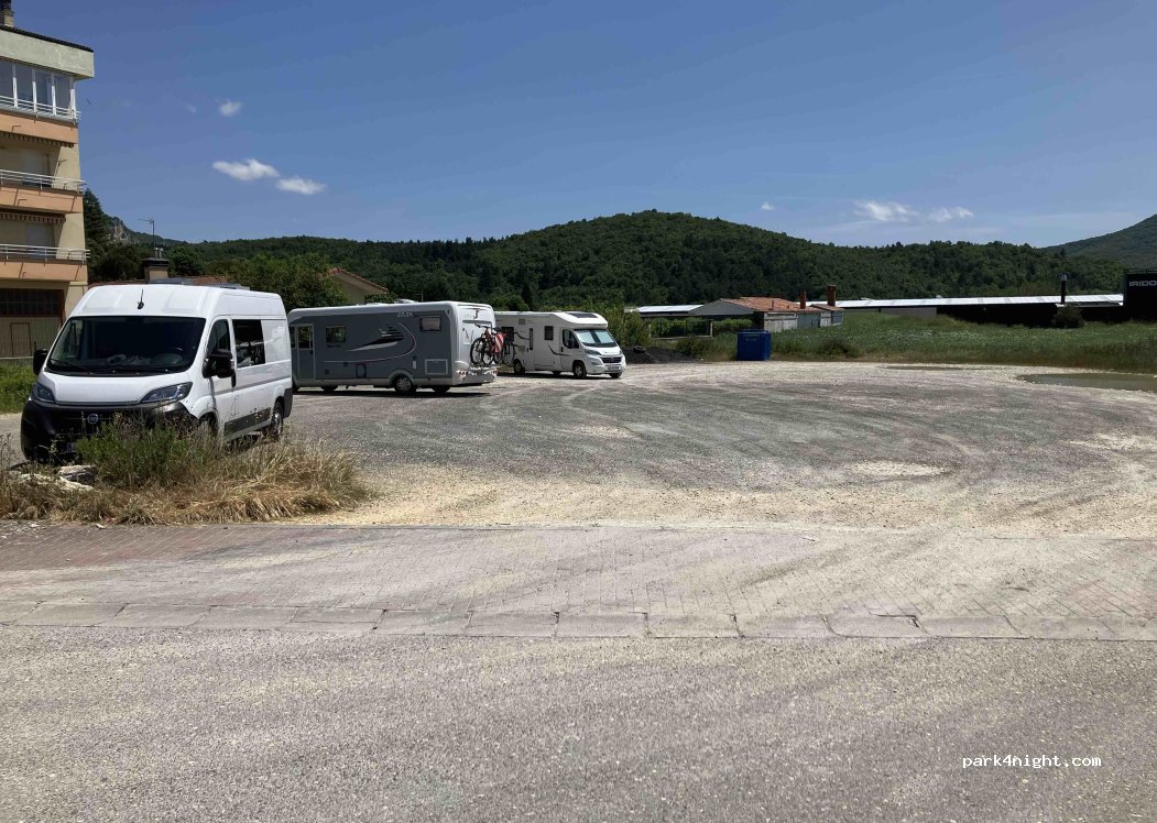 Parking located 100 meters from the road, but at night there is very little traffic without services, it is a safe place, with a restaurant bar and accommodation 30 meters away. Quiet place, although they usually park trucks that spend the night there, it is not a wonderful place, much better Run but if it catches you at a bad time or you do not want to deviate from the route it is perfect, it has a block of buildings next to it with several neighbors Very nice habituated to vans and motorhomes. The above is not a remarkable place but it assures you a night without major complications, neither the police, nor the town hall, nor the town puts problems.