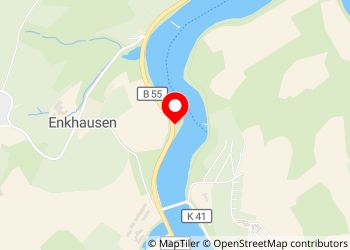 Parkplatz an B55. Zwischen Straße und Picknickwiese am Stausee. Kleiner Zugang zum Wasser.