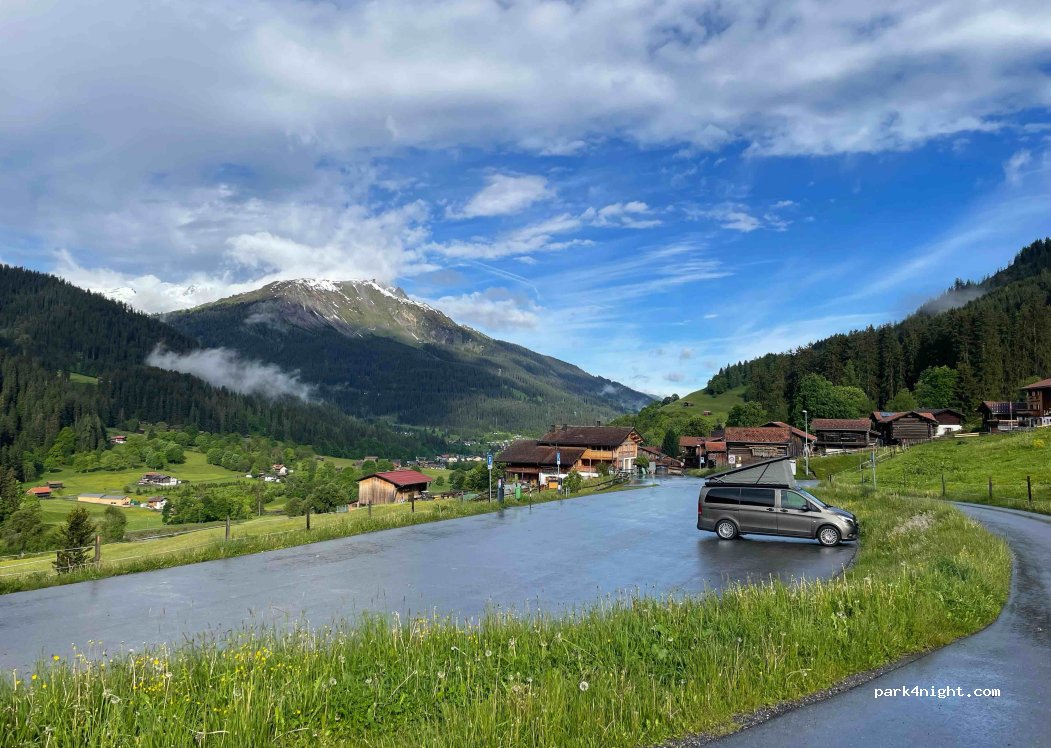 Nice parking lot in Klosters / Monbiel. Simple toilet available. Starting point for various alpine hikes to SAC huts or to the family-friendly Alp Garfiun. Postbus terminus right next to it (excursions to Klosters or back to the camper for longer hiking tours). Public garbage disposal station on the street a few hundred meters towards Klosters. Alternative parking space also available in the direction of Klosters. Payment cashless, possible via various apps and TWINT. Water can be fetched up the hiking path at an animal trough 200m.