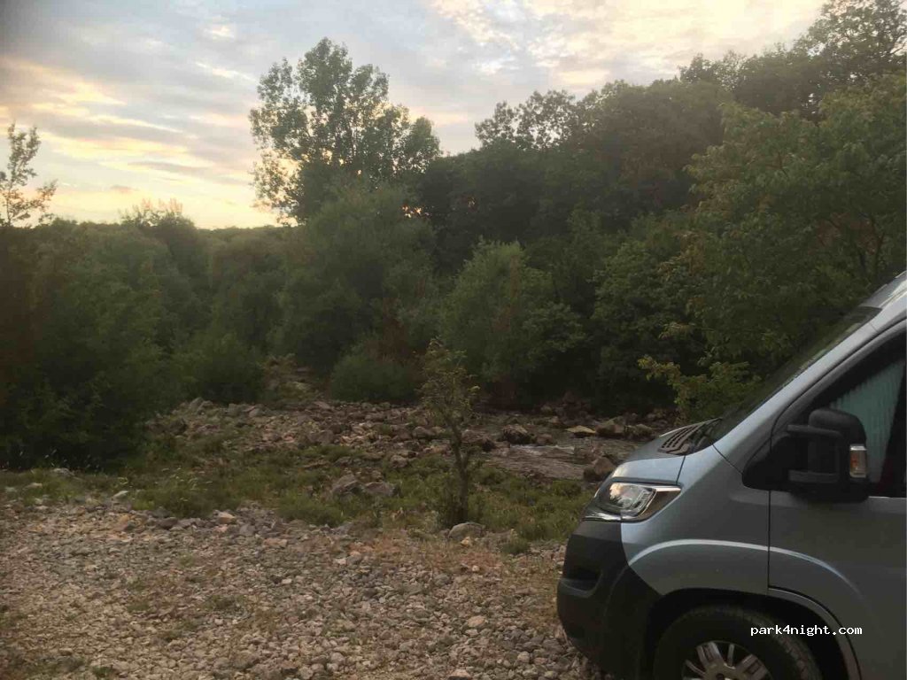 Restez à gauche de la route principale sur le pont. C'est là que commence le chemin de terre non pavé, jusqu'à un autre petit pont juste à côté d'un ruisseau où il y a un endroit merveilleux pour rester. Attention aux vaches en liberté. Très beau bruit à distance de l'eau.