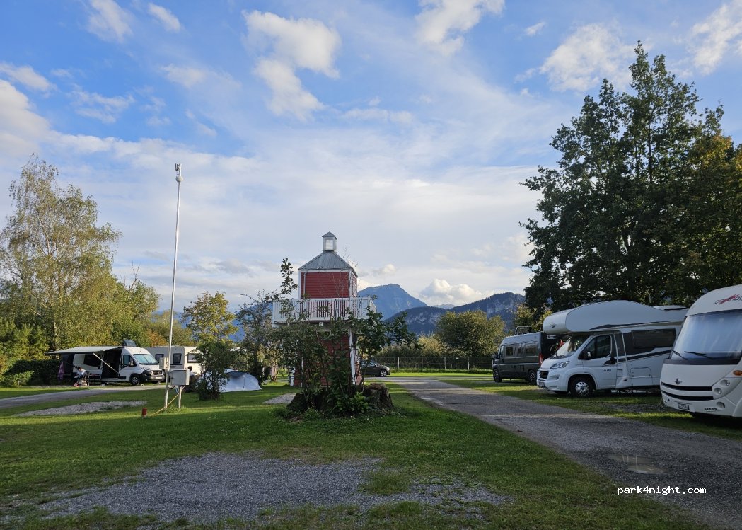 Es ist ein sauberer CP. Rezeption nett. Service ist einfach aber ordentlich. Abwasch,WC und Dusche in einer Art Holzscheune mit Zimmerdecke offen.Blick auf die Berge.Badi in 5 min Fußweg ist recht schön. Was nicht schön ist ,ist der Sportplatz daneben. Wochenende ist oft Spiel mit Lautsprecher und Jubelchor.Sonst Training.Spielplatz ist okay. Leider kein Seeblick da Naturschutzgebiet mit Schilf.