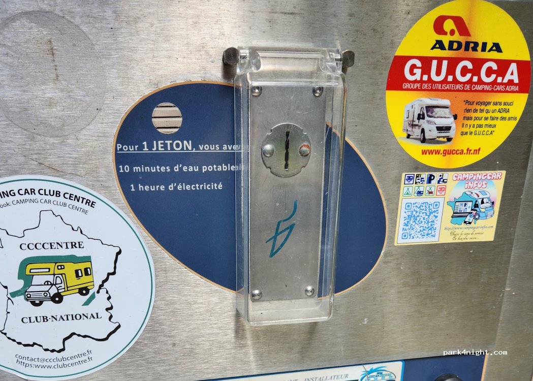 Parfait pour y passer la nuit . Borne à jetons que l’on peut acheter 2€ à la boulangerie ou l’épicerie. Nuit très calme.