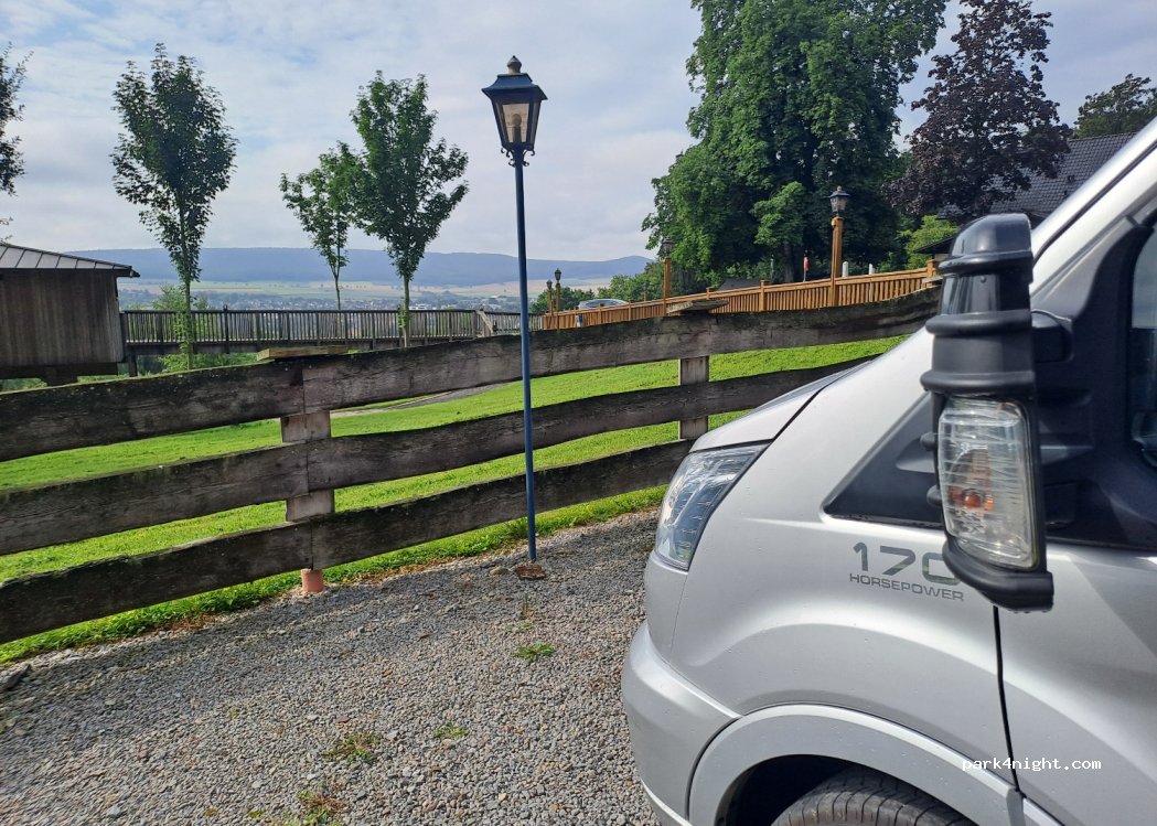 Schöner, ruhiger Stellplatz am Hotel und Restaurant Waldquelle, sehr freundliche Begrüßung, Strom wird angeboten, Brötchenservice oder Frühstück möglich, vom Hotel schöner Blick ins Tal, vom Stellplatz schöner Blick zu den Baumhäusern, Stellplatz auf Schotter- leicht schräg, mit Auffahrkeilen gut auszugleichen, Hinweisschild auf der Straße, gute gepflasterte kleine Zufahrtsstraße
