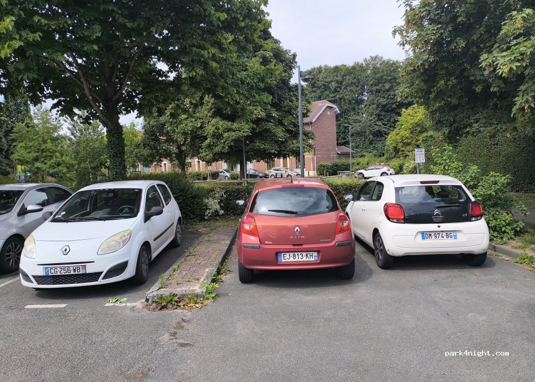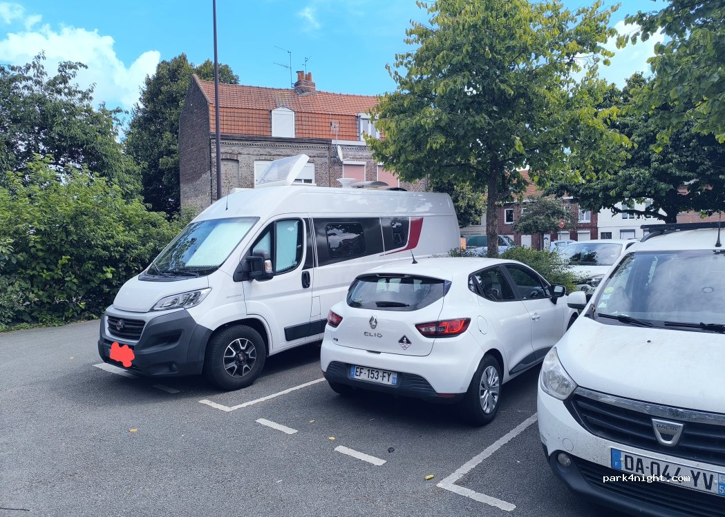 Nous y avons passé 3 nuits du vendredi soir au lundi matin. Nous étions en camping car et avons pu nous garer assez facilement. Endroit calme, proche d'un petit parc. Tres bien situé, très proche de la station de métro, à 5 minutes à pied. Ligne allant dans le centre de Lille, à 4 arrêts. Donc emplacement idéal. C'est un parking donc pas de WC ni point d'eau.