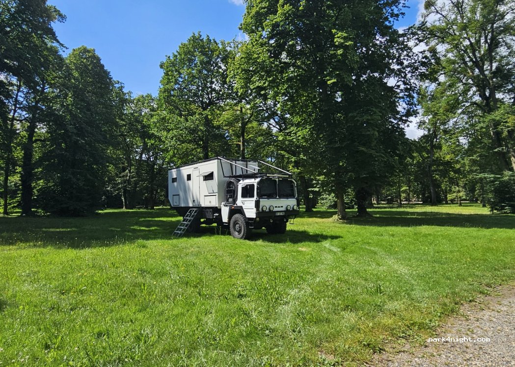 Beaucoup de places, terrain plat sous les arbres mais méfiez-vous sur les photos, on ne peut pas juger le bruit des nombreux camions. Trois camions et trois camping-cars garés. Très proche du parc Astérix.