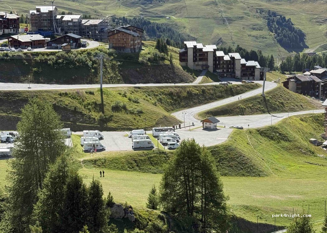 Belle aire en "étage" avec des emplacements bien large et une superbe vue. Le tarif est de 10€ en été et 22€ en hiver électricité inclus. A 5mn du centre de La Plagne village et au départ de balade en été et juste à côté d une piste de ski. On a particulièrement apprécié cette aire, pour un lieu touristique les tarifs et service nous semble très correct.