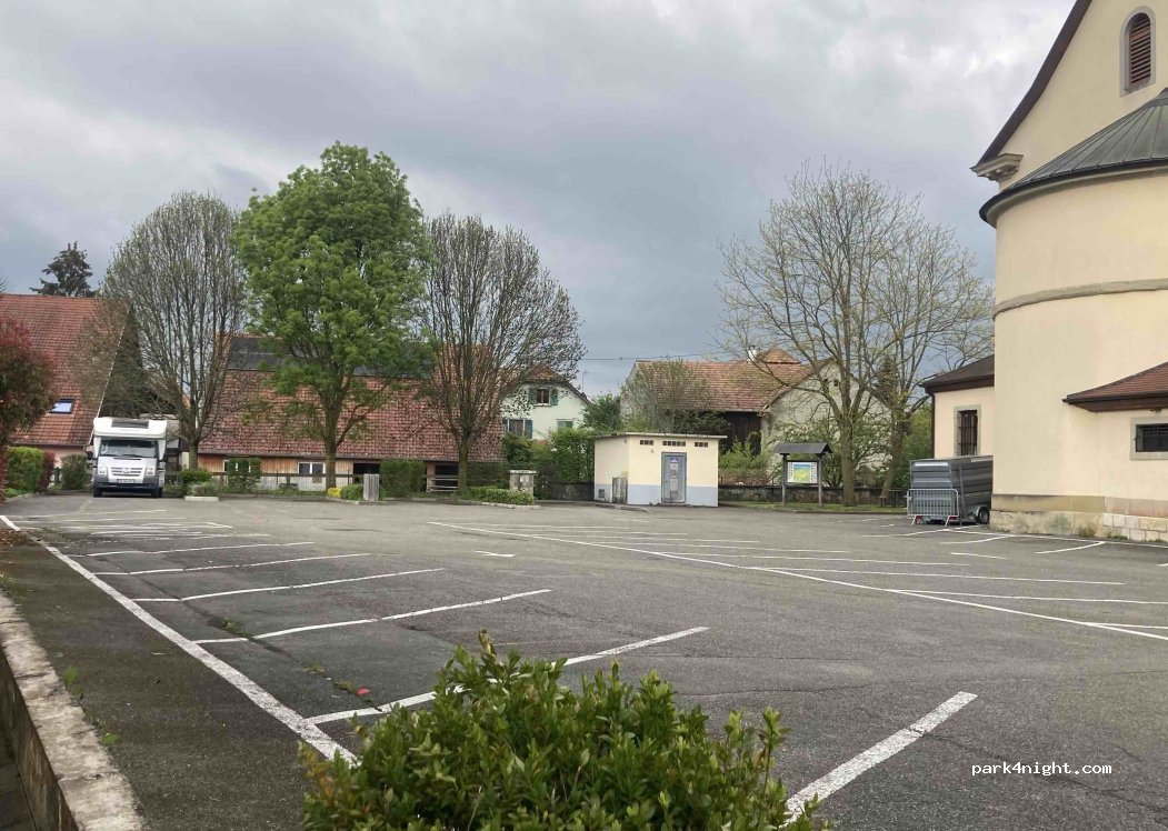 Grosser Parkplatz mit 3 Parkbuchten für Camper. Als wir ankamen, waren die Parkbuchten bereits besetzt. Wir konnten dennoch auf dem Parkplatz übernachten. Die Kirchenglocken schweigen in der Nacht. Morgens um 6 Uhr fängt das Läuten wieder an. Danke der Gemeinde für den Platz.