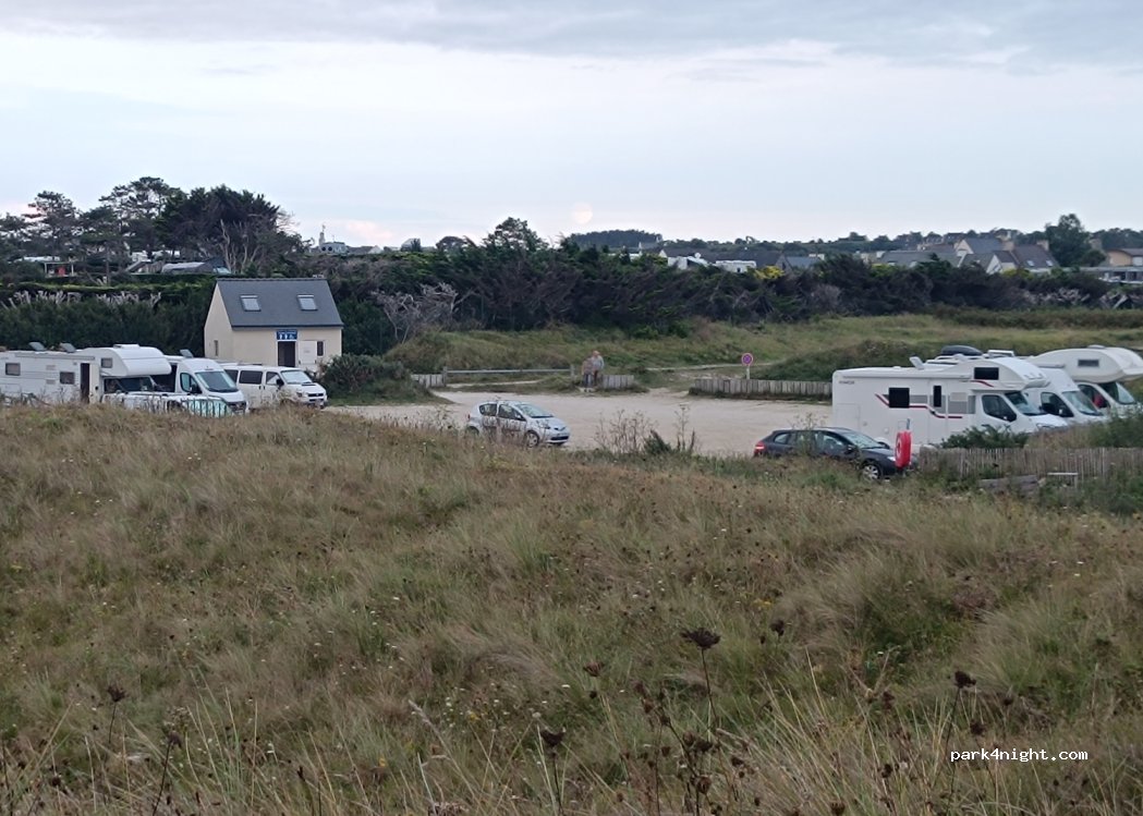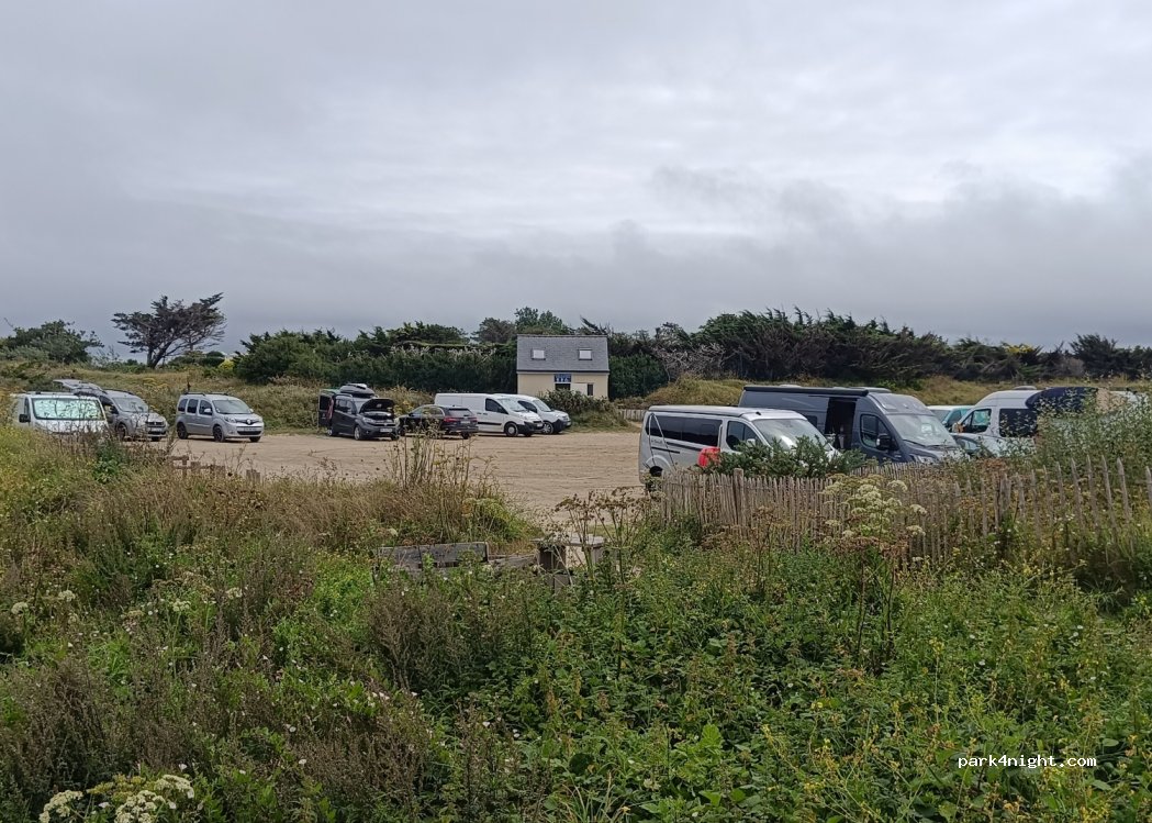 Grand parking, beaucoup d’espace chacun même à 6 van. Sanitaires propres. Accès facile à la plage par les dunes. Belle balade vers les iles Tarieg et Guenioc à marée basse. Points de vue superbes. Coucher de soleil exceptionnel avec pluies d’altitude colorées de rose et de violet. Seul bémol : parking très pousserieux par temps sec ( dont on ne va pas se plaindre !).