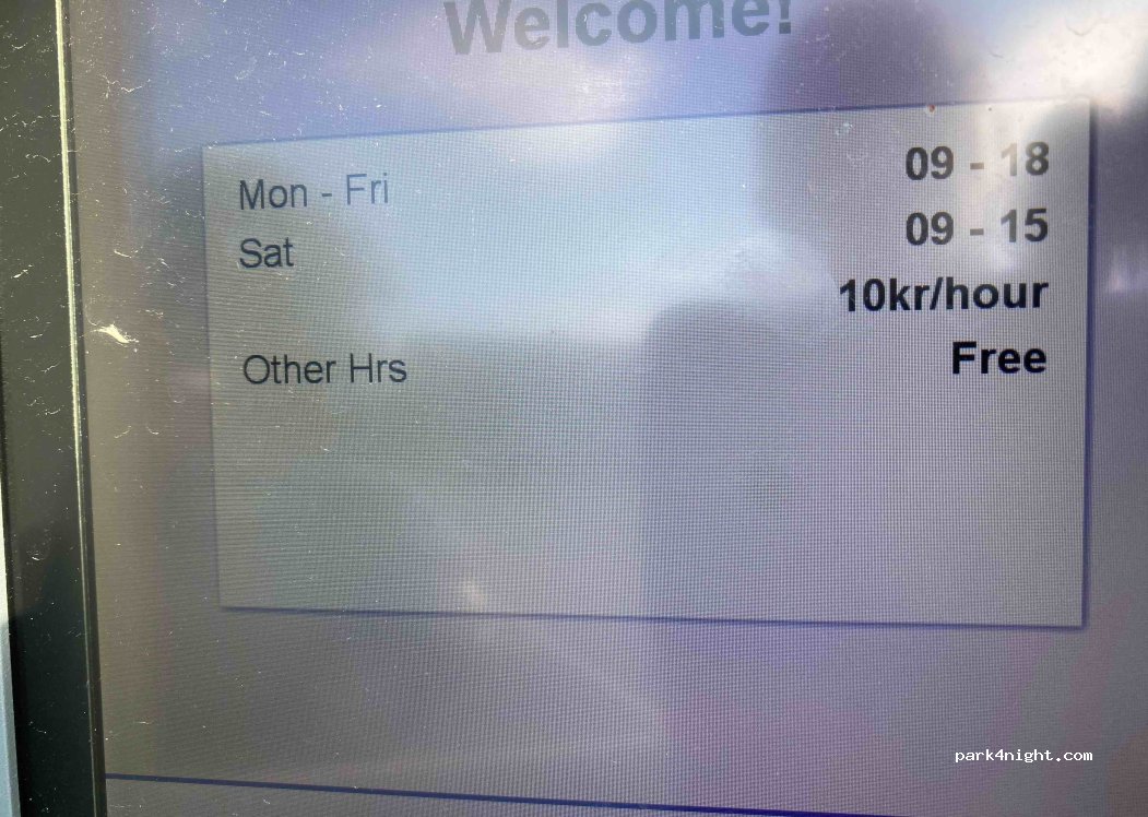 Ce parking est un parking urbain, et n’est gratuit que le dimanche ou en dehors de plages horaires les autres jours. Donc, il est possible d’y stationner la nuit, mais pas la journée (payant 10 couronnes /heure). Il n’est pas non plus tout à fait plat. Nous n’y sommes pas restés. Pour dépanner, ça peut convenir mais sans plus !
