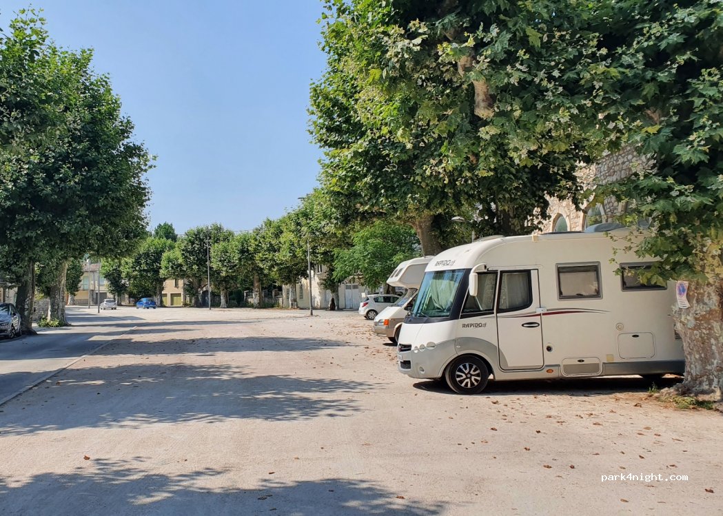 Parking plat, point d'eau près du local des boulistes. WC, mais entretien moyen. Reveil le matin avec les tourterelles. La ville est intéressante à condition d'éviter les déjections canines.