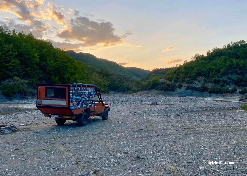 Endroit agréable et calme, mais rocheux sur la rive du fleuve. Prenez note de la partie raide sur la route d'accès. Voir les photos.