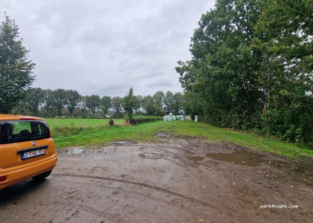 Een gras parking van 20x100 meter. Zaterdag 10 Augustus 19u en we staan alleen. De aanpalende bossen, provinciaal natuurgebied zijn uitmuntend om te wandelen en er zijn voorzieningen.