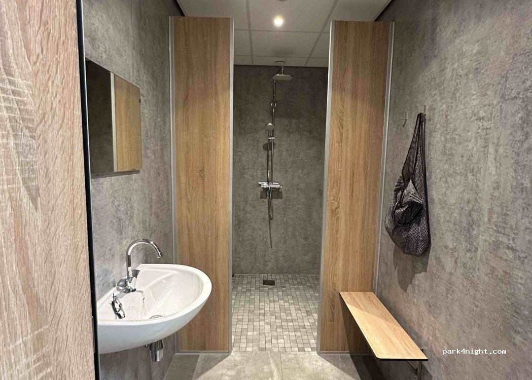 Luxurious parking space in the Dutch Black Forest, space for 60 mobiles, asphalt, toilet, shower with underfloor heating! Living room with seating, television, coffee machine and food dispenser. Reservation possible. Payment by machine Summer with swimming pool, winter with sauna
