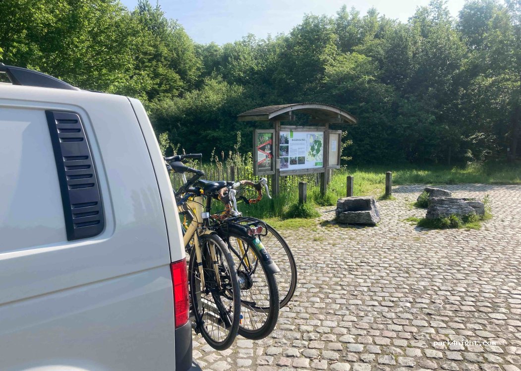 Ruime parking net aan het bos. ‘s Avonds heel rustig om te staan. Geen nutsvoorzieningen.