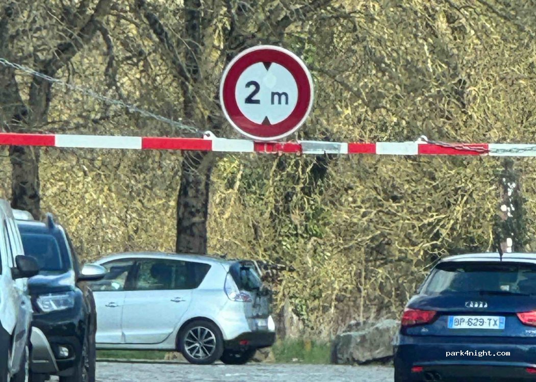 Allez au bout de la rue ! La barrière de hauteur pour le grand parking n'est pas toujours fermée. Sinon la rue est plus adapté aux véhicules pas trop large.