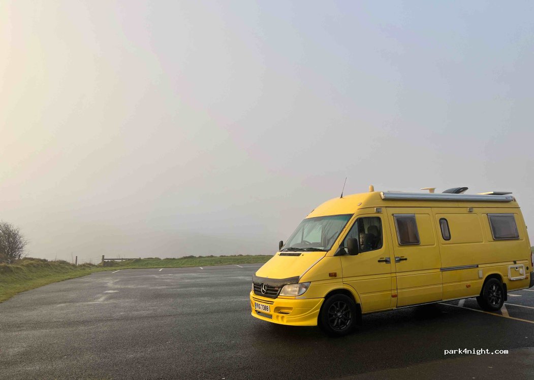 Stayed overnight. Very windy but that didn’t stop us from having a good nights sleep. The car park is pretty big and is on a slight downward slope. Toilets in the corner of the car park. There’s a cool (slightly scary) walk along the ridge from the car park so ideal for our dog. Good 4G on EE.