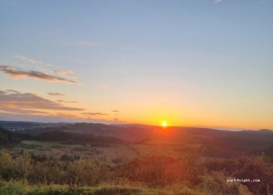 A secluded spot with a beautiful view. A fantastic sunset. Located close to the beautiful Schalkenmehrener Maar lake. Two seating areas, each with a table and two benches. A small parking lot suitable for a maximum of two campers. Flat.