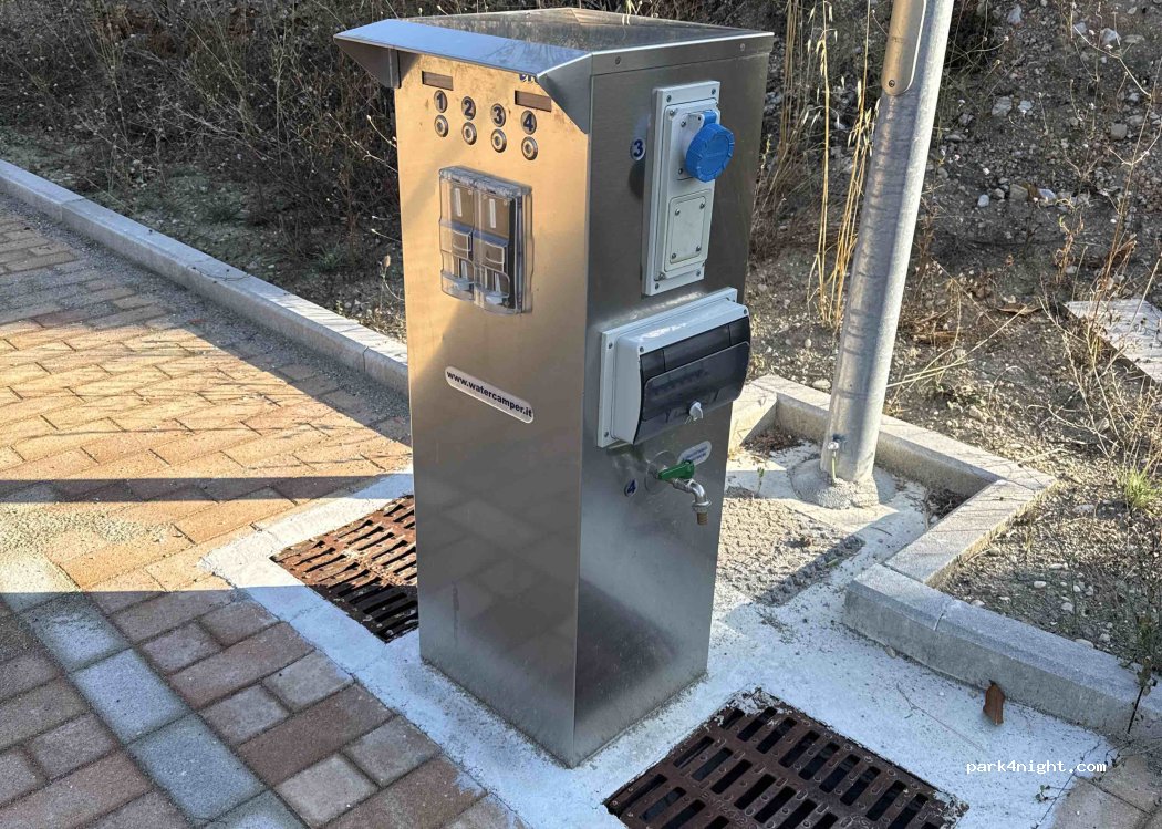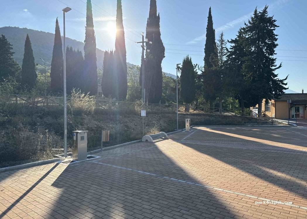 Come già descritto parcheggio libero a fianco del campo sportivo, area Camper con acqua, corrente carico e scarico terminata ma al momento non ancora operativa.