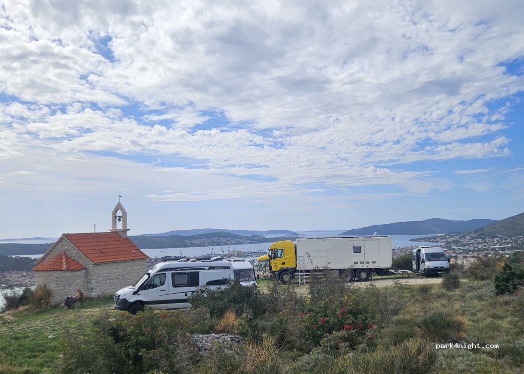 Incroyable vue sur Trogir, l'île de Ciovo et Split au loin, emplacement pour quelques voitures/vans/camping-cars (3 places environ) au calme à côté d'une église. Le sentier pour y accéder est accidenté mais se fait bien en véhicule. Rencontre d'un couple de français en prime. Lieu propre et apaisant, merci de maintenir ce lieu comme vous le trouverez !