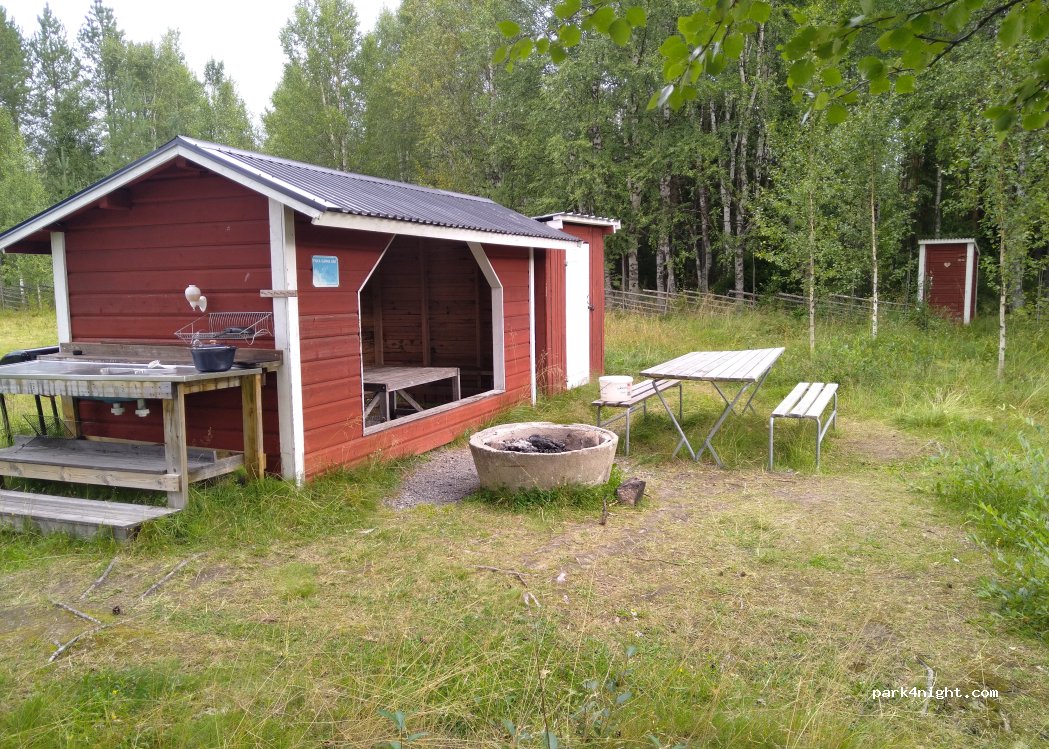 so-called. nature campsite (shaded parking on grass with picnic benches) by the water, along the road. Dry toilet available.