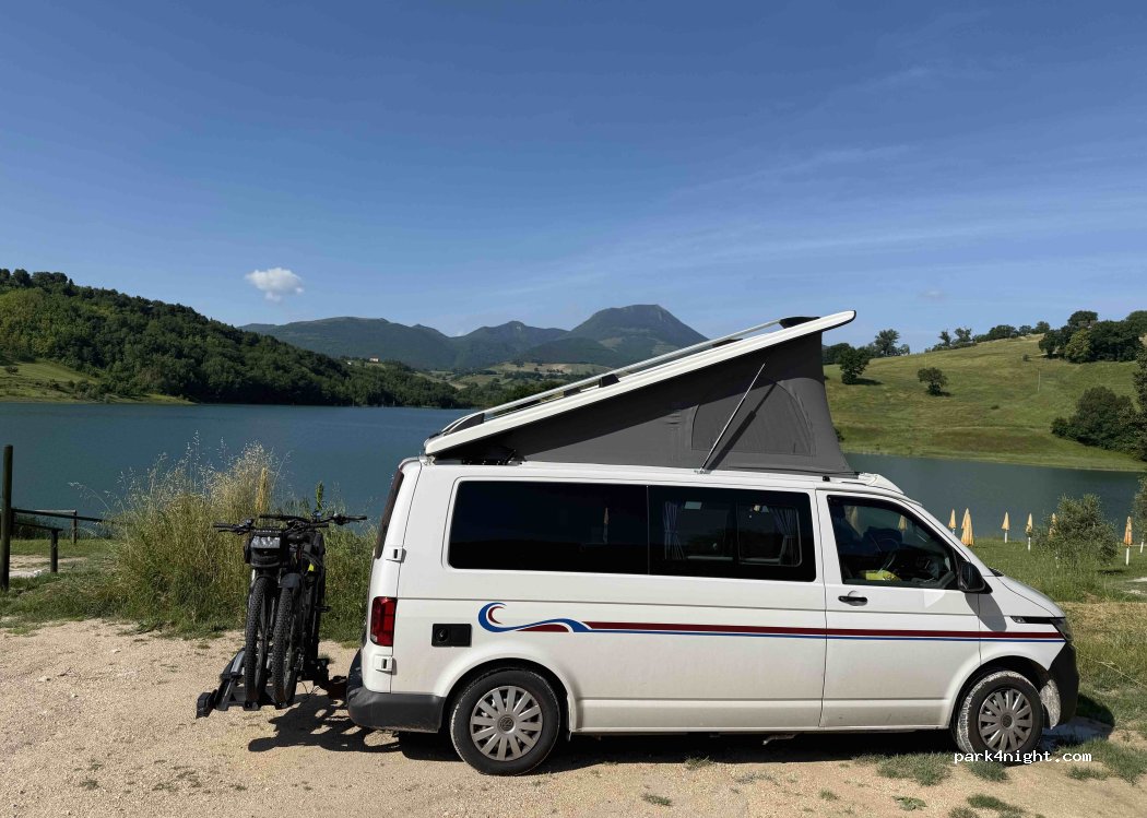 Luogo incantevole proprio sul lago ,molo x potersi tuffare ,bar con proprietaria molto disponibile . I servizi sono del bar come anche l elettricità e l acqua che gentilmente li fornisce però la strada è molto ripida e piena di buche nonché in forte pendenza x poter dormire .Per un risveglio sul lago però ne vale la pena...