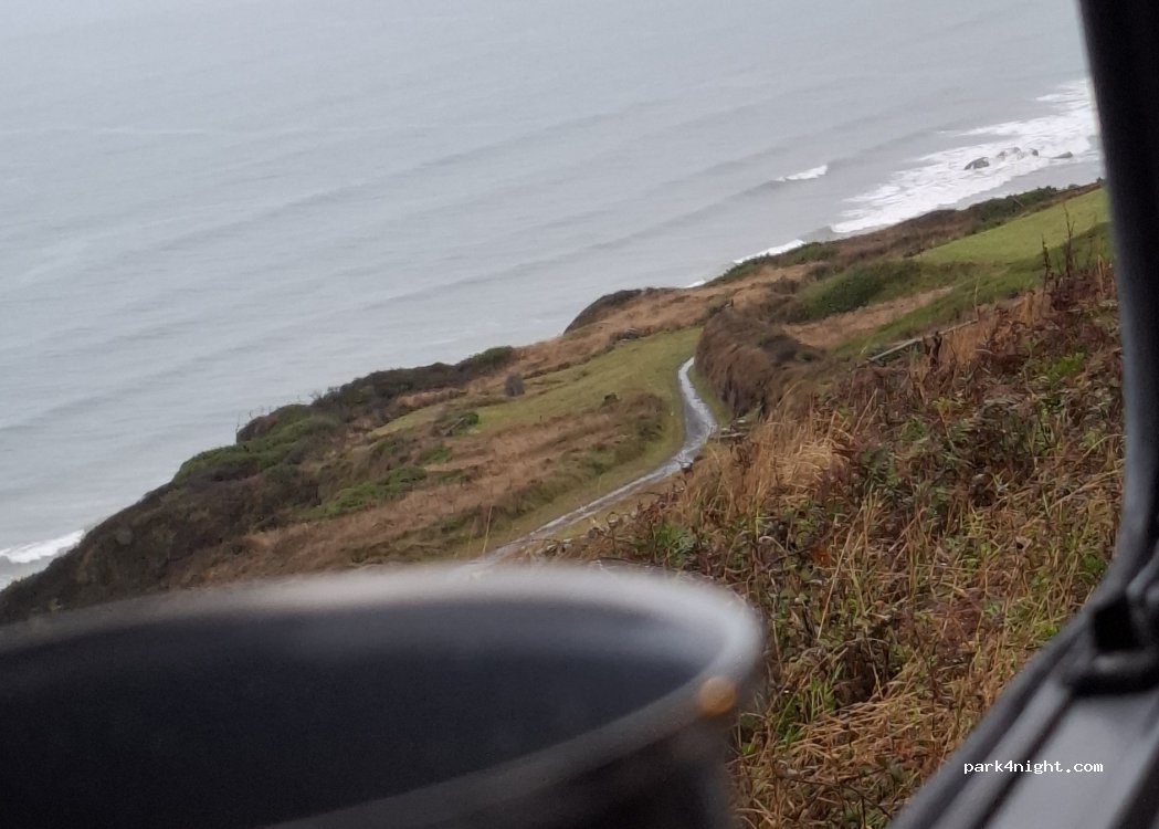 Can park on the coast side too, no restrictions, no problems. Just move over as much as possible to let other vehicles through easily. Popular place to park so be considerate of parking and noise. In day time there's more places further down the hill on a steep slant but more suited for cars rather than vans. Go to the beach and find the waterfall !!!