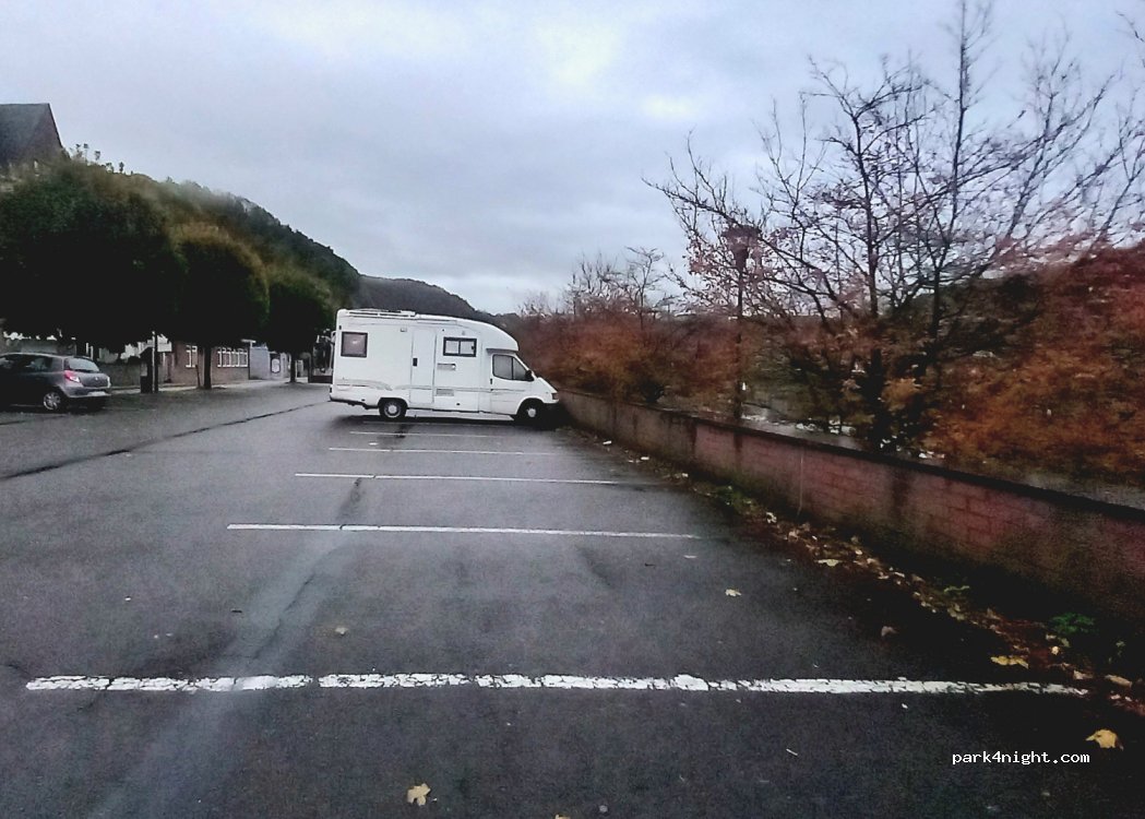 Parking with unobstructed views of the Meuse. 4 marked parking spaces, 2 being long enough to accommodate 7mtr campers whilst allowing enough footpath space to the rear for wheelchairs & pushchairs to safely pass. I asked a passing Police Officer who had no problem with us staying overnight. A large bin on the lower path. Very noisy with busy traffic during the day but quiet overnight.