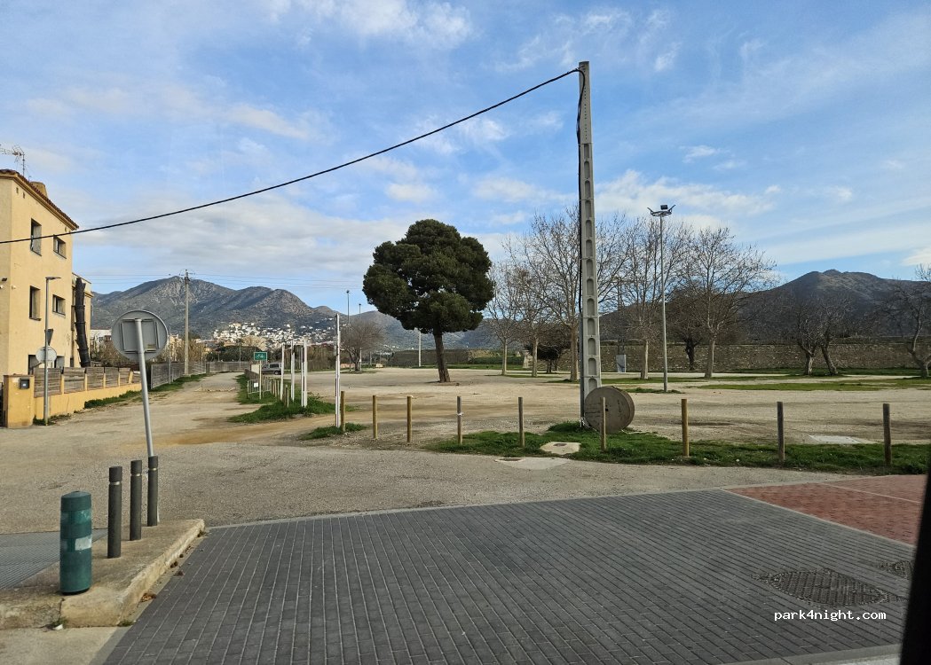 Parking gratuito de tierra al lado de la playa y de la ciudadela (parque arqueológico de Roses). está al lado del paseo marítimo y hay muchos aparcamientos, si coges sombra se duerme muy bien. Hay altura para entrar, 2 metros o 2,20, no lo ponía.