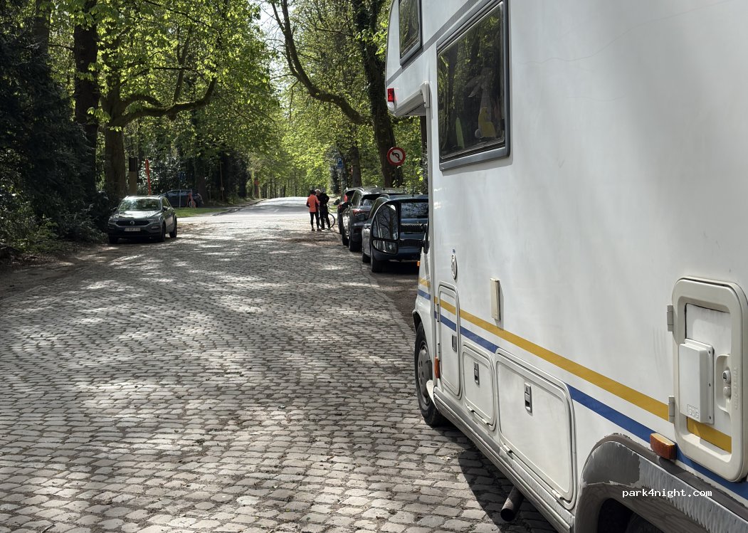 Parking behind the Tervuren Palace, 100m from tram 44 which brings you to the center of Brussels Very quiet and rather empty at night but plenty of parking during the day. 200m from the center of Tervuren with restaurant, bar, supermarket ... Large playground also 100m. No service but satisfactory 4G. Any vehicle, even heavy goods vehicle, can access it without any problem.