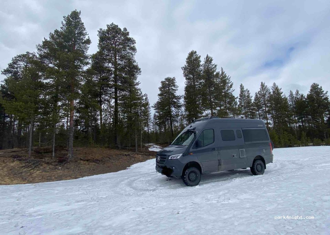 Ampio parcheggio a fianco della strada vicino ad un fiume. Possibilità di passeggiare in mezzo al bosco. Strada principale poco trafficata, quindi abbiamo. passato una notte tranquilla.