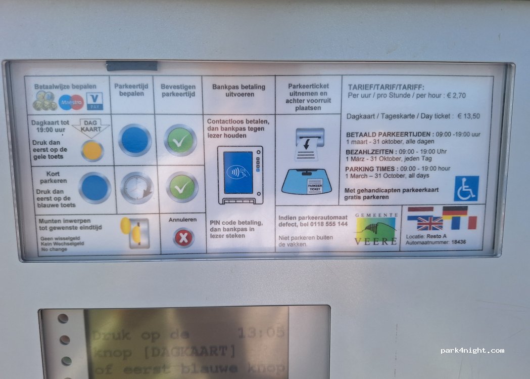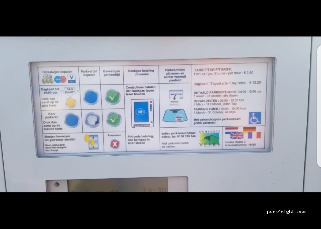 Großer Parkplatz mit aber nicht übergroßen Parkbuchten. Wir kamen extra wegen des angekündigten Stromterminals her. Reinfall! Es gibt zwei Terminals für E-Autos, sonst nix. Immerhin Strandlage. Platz ist kostenpflichtig von Mai bis Oktober.