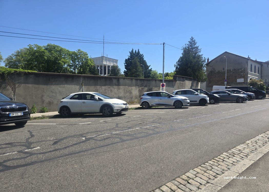 Parking gratuit facile en JOURNÉE uniquement, légèrement de travers. Convient UNIQUEMENT aux fourgons courts ou aux petits camping-cars.