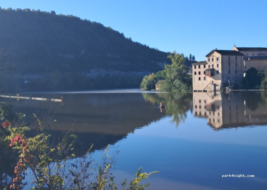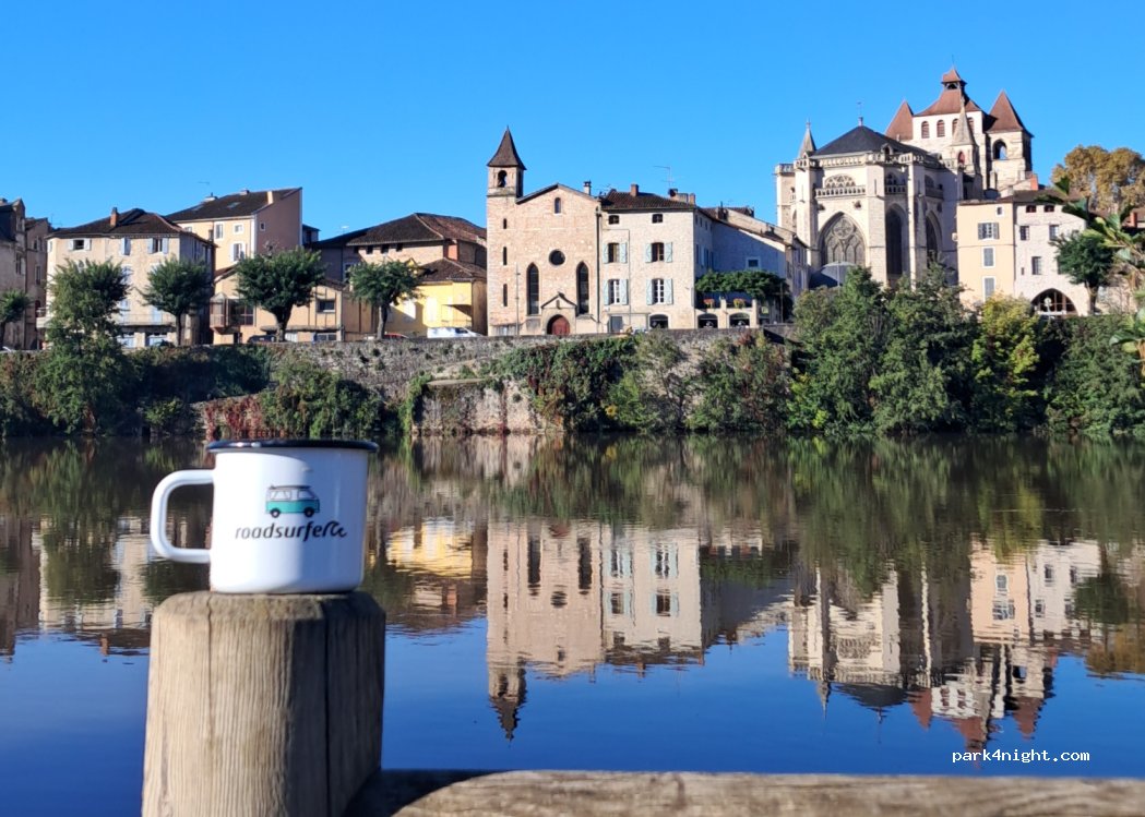 Très bon spot, à condition d’avoir un petit camping car/van (4,85m pour ma part) j’ai eu la chance d’avoir pu me garer à la dernière place disponible un samedi après midi. Vue sur le Lot et très tranquille. A 2 pas du centre ville en traversant le pont.