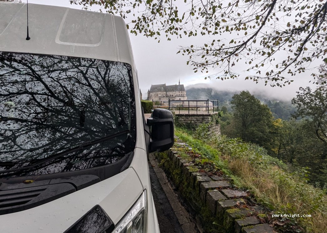 we parked at the top of the hill where the monument is. we couldn't see any designated parking signs so stayed close to the wall. in the morning we moved down the hill to the free parking area at the side of the road and had a walk into Vianden. amazing views.