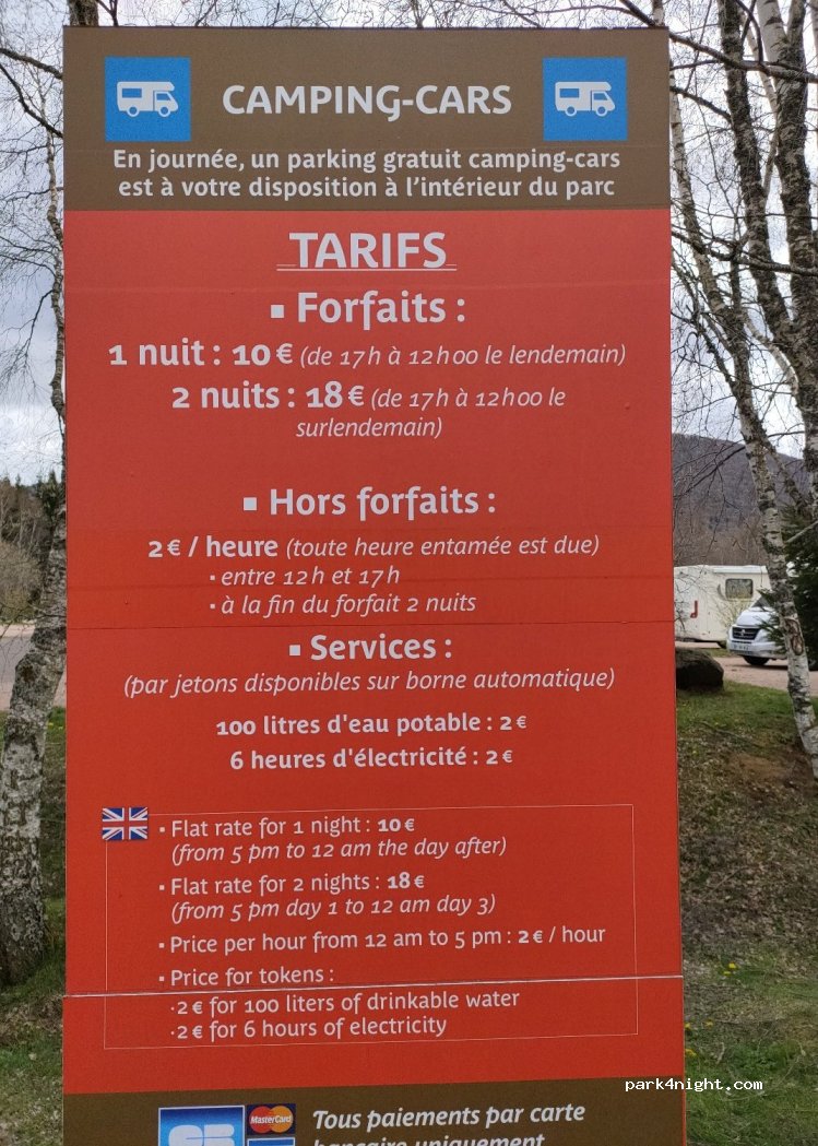2 nachten verbleven €18. Omslachtig betaalsysteem, alles alleen in Frans, tip: klik eerst op functie die je wil en dan pas ticket scannen. Slechts enkele elektriciteit plekken. Poort is zeker langer dan 1u na sluiting park open, er kwamen campers nog om 23u45 binnen. Toiletten bij poort naar park, die is wel na sluitingstijd dicht. Park zelf is nutteloos als je geen Frans spreekt, tegenvaller.