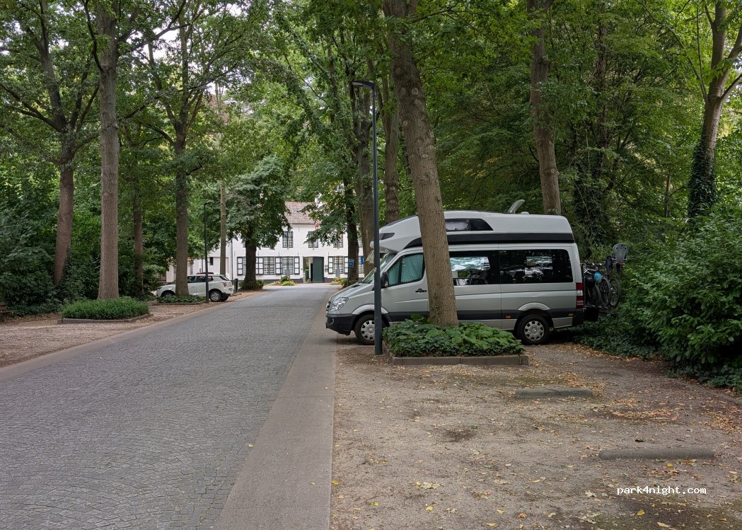 Bra för ett dagsbesök i Brugge. Träden skuggar bilen behagligt på varma dagar. Gratis och utanför 4h zonen, vilket är bra då Brugge tar mer än 4 timmar att klara av. Vår 6,40m van med ytterligare en meter cykelhållare gick in precis så runt 7,40m är nog maxlängd. Lätt att ta sig in till centrum på cykel.