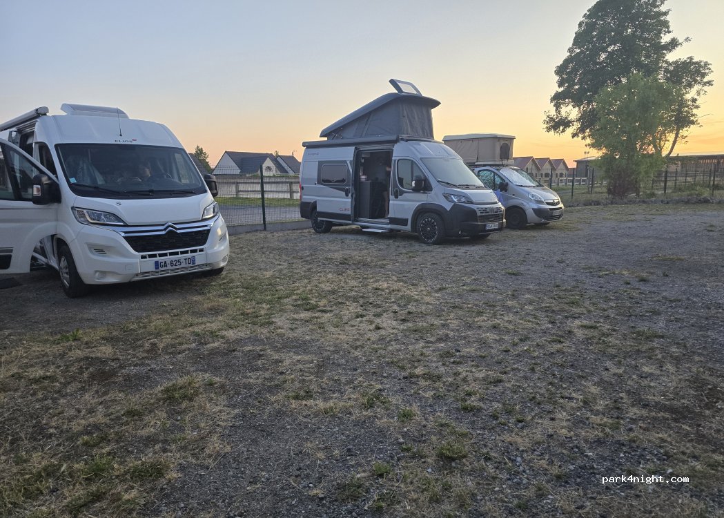 Nous sommes arrivées à 20h45, il n'y avait aucun problème pour les personnes de nous accueillir à cette heure. (On avait demandé l'accord avant d'arriver).L'endroit est sécurisé car l'entrée est fermée par un portail électrique. Emplacement plat, juste derrière leur maison. Nuit tranquille, calme. A 7h, il y a eu le bruit du tracteur du haras mais rien de dérangeant pour nous. Nous recommdons.