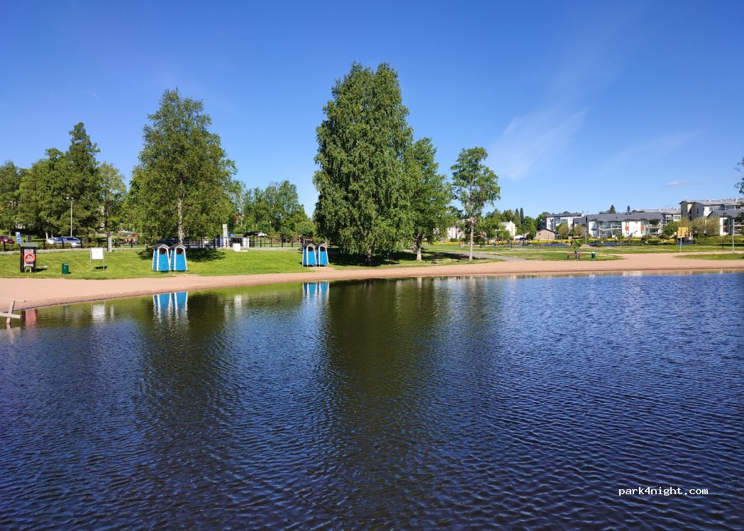 Public beach, a place to wash carpets during the summer, large playground for kids. Parking 3 hours with disc mon-fri 07-16, on other times no limits. Toilets open during summer season until 21.30.